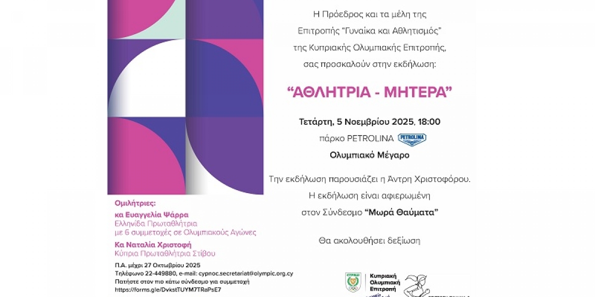 Η Επιτροπή «Γυναίκα και Αθλητισμός» της Κυπριακής Ολυμπιακής Επιτροπής διοργανώνει την Τετάρτη 5 Νοεμβρίου (18:00) την εκδήλωση «Αθλήτρια-Μητέρα. Η εκδήλωση θα πραγματοποιηθεί στο «πάρκο Petrolina» του Ολυμπιακού Μεγάρου και τιμά τη γυναίκα που ερμηνεύει παράλληλα και ισότιμα τους ρόλους της αθλήτριας και της μητέρας.